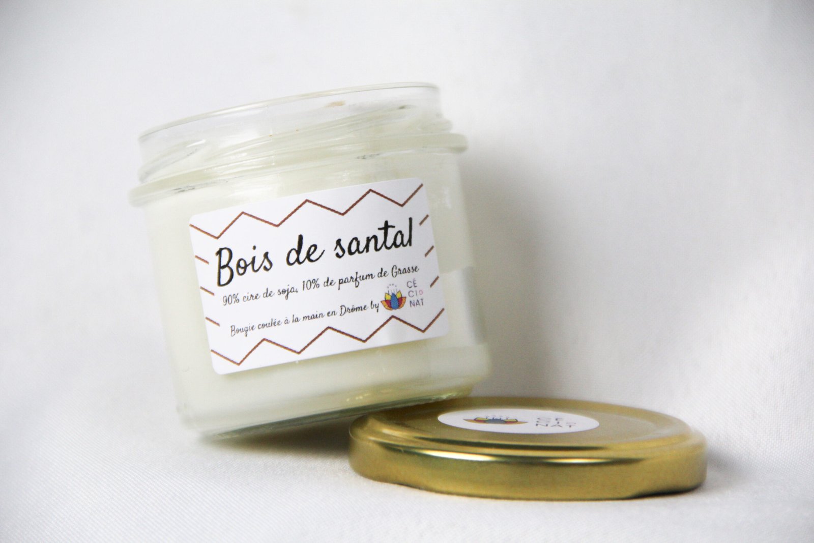 Bougie coulée main en Drôme, composée de 90% de cire de soja sans OGM, biodégradable et végan et de 10% de parfum fait à Grasse.