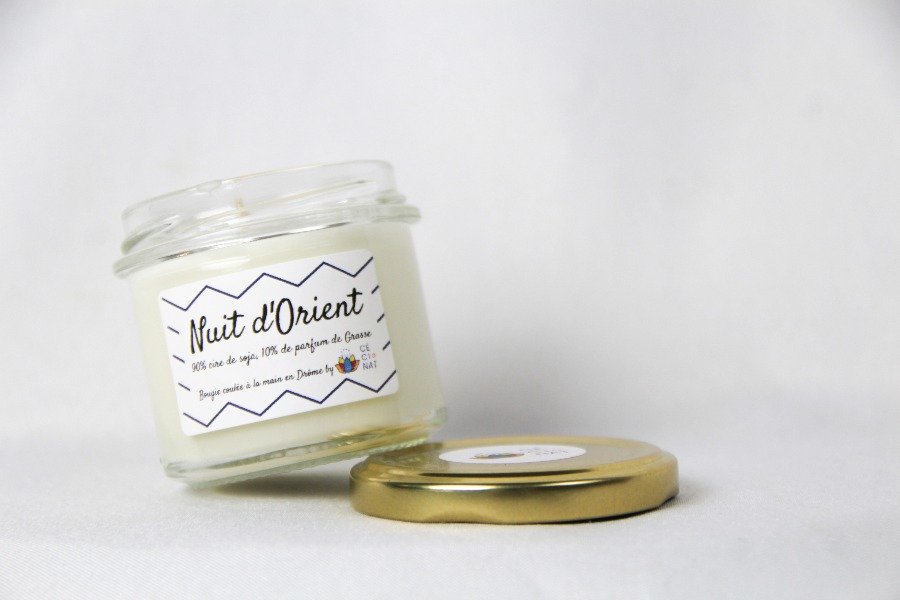 Bougie coulée main en Drôme, composée de 90% de cire de soja sans OGM, biodégradable et végan et de 10% de parfum sans CMR ni PHTALATE fait à Grasse.