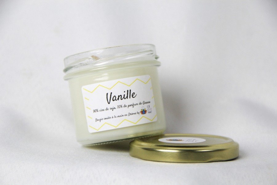 Bougie coulée main en Drôme, composée de 90% de cire de soja sans OGM, biodégradable et végan et de 10% de parfum sans CMR ni PHTALATE fait à Grasse.