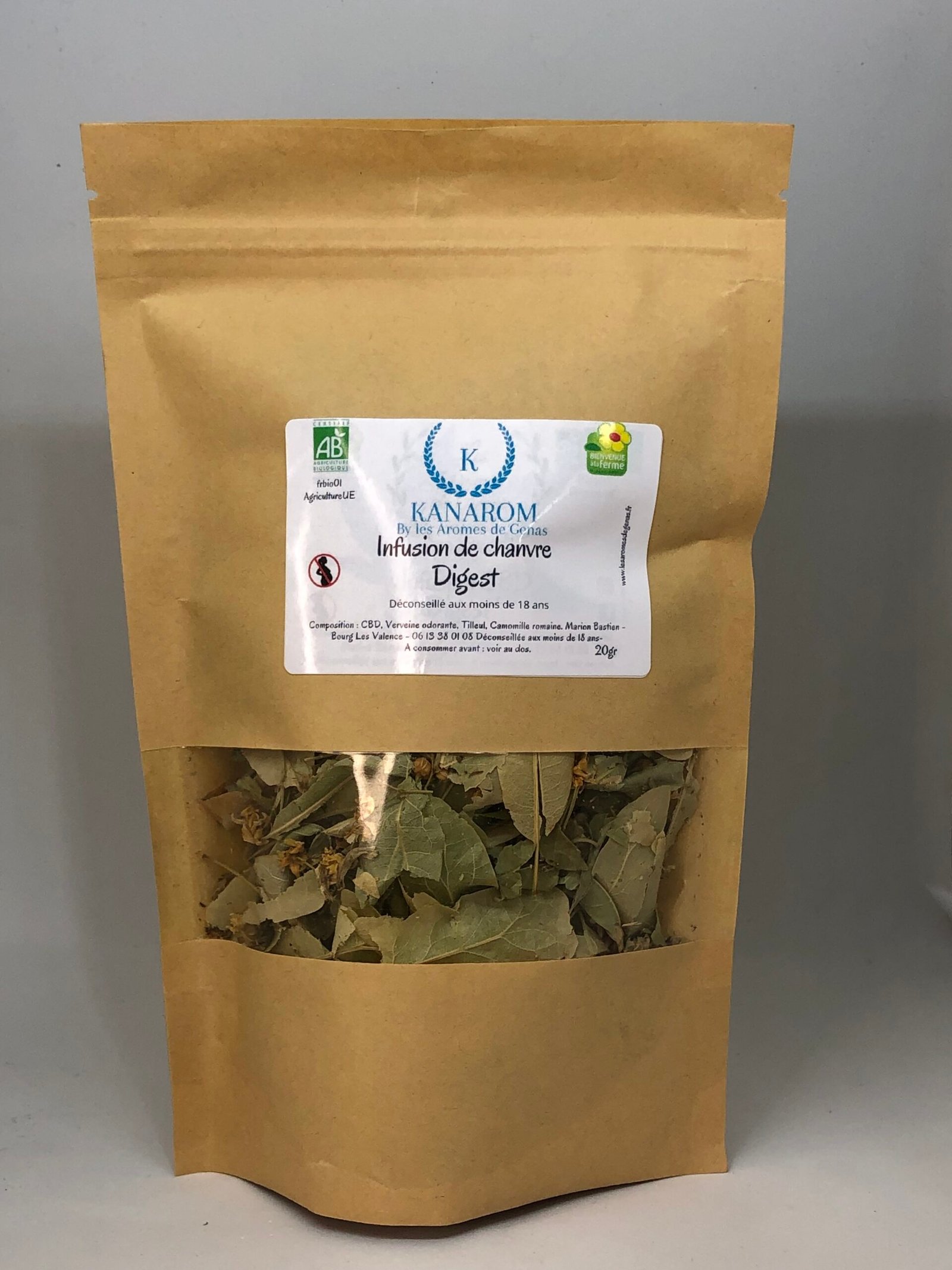 L’infusion Digest contient 20% de chanvre bio cultivé, sous forme de fleurs, et de feuilles. Dans cette infusion, le chanvre est totalement débarrassé de toute trace de THC. Ce produit est donc légal et sans aucun effet psychotrope.