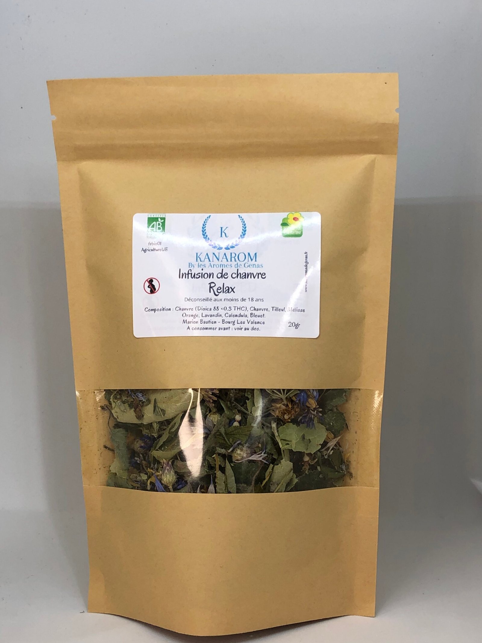Composition : Chanvre (<0.3 THC ), Chanvre, Tilleul, Mélisse Orange, Lavandin, Calendula, Bleuet.